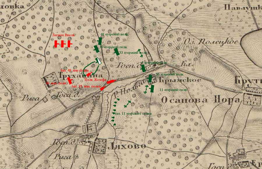 "...В то самое время, когда мы следили за этим боем, на нас посыпались выстрелы из вышеупомянутого березового кустарника. Немедленно вперед было брошено несколько рот вольтижеров, но они были встречены так дружно, что отступили в беспорядке. Генерал Хлопицкий вышел из себя, приказал вольтижерам повторить атаку, однако и вторичная атака кончилась тем же. Лесок был занят сильно и противник превосходно пользовался местностью. Во время атаки наши попали под перекрестный огонь. При всем том, можно было заметить, что позиция русских не могла быть слишком велика. Полагаю, что если бы мы маскировали фронт несколькими батальонами, а с другими обратились больше против правого фланга русских, то вытеснили бы их без особенного урона. Но Хлопицкий, раздраженный отступлением вольтижеров, стал во главе второго батальона первого полка, приказал следовать за ним (en echelon) второму полку и бросился вперед. Сначала этот энергичный маневр смутил неприятеля, судя по тому, что он стрелял реже: но когда мы подошли к опушке шагов на сто, то были встречены таким дружным, таким метким огнем, что понесли весьма чувствительный урон. Мы проникли однако в лесок, который русские оставили без большого сопротивления. Между ранеными оказалось много офицеров; в том числе и генерал Хлопиций (ему раздробило ногу) и его адъютант. Всего мы потеряли убитыми и ранеными до ста человек.