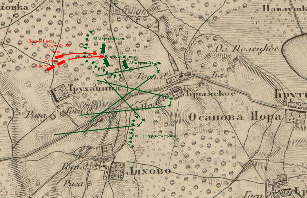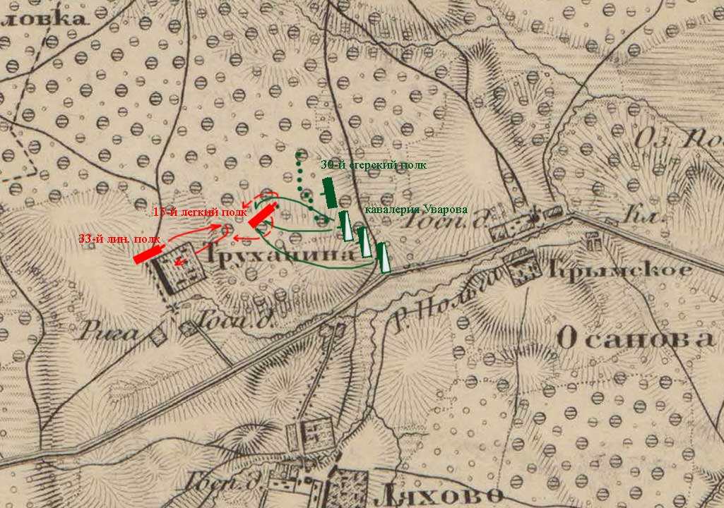 10-го (29-го августа), поднявшись в девять часов, мы едва прошли версту, как возобновилась канонада, и притом с большею силою, нежели накануне. Вскоре послышались и ружейные выстрелы; они послужили нам доказательством, что в авангарде, кроме нас, была еще другая пехота. Хотя завязавшееся дело прекратилось скоро, однако, спустя короткое время, столкновение повторилось, и мы подвигались вперед медленно, не зная, что происходило впереди и вокруг нас. К полудню канонада усилилась; с некоторых пунктов виднелись линии многочисленной кавалерии. Во втором часу нас передвинули влево от дороги и мы следовали по гребню высот, ее окаймлявших2. Вправо от нас, но довольно далеко, стояли колоны пехоты; по левую сторону их кавалерия в линиях и колонах; впереди сильная артиллерия. Кажется, мы образовывали крайний левый фланг; перед нами лежал густой березовый кустарник3, тянувшийся до покатости горы, у подошвы которой проходила дорога. Вдали, на ровном месте, мелькала деревня, вероятно Крымское. Мы находились, может быть, на расстоянии пушечного выстрела от леска, когда по правую нашу руку загорелось жаркое дело. Французская кавалерия была опрокинута; некоторые пехотные колонны и каре были, в буквальном смысле, смяты русскою конницею; однако французская кавалерия, стоявшая в резерве, поспешила на помощь, отбросила русских, смяла, в свою очередь, их пехоту, отчасти бросившуюся на землю, и преследовала противника до его артиллерии4.