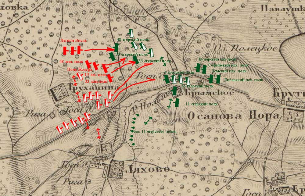 Выдвижение легиона "Висла" для атаки правого фланга русской армии и бой легиона с русскими егерями.